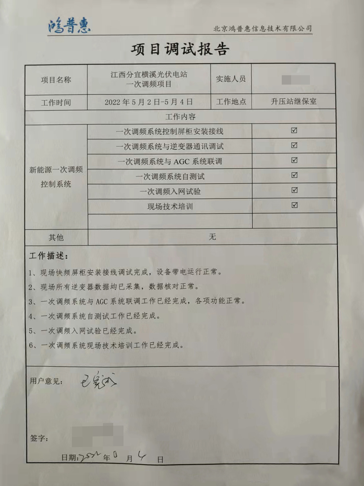 2022年5月4日,鴻普惠承接的江西分宜橫溪光伏電站一次調(diào)頻入網(wǎng)試驗(yàn)檢測(cè)順利完成。