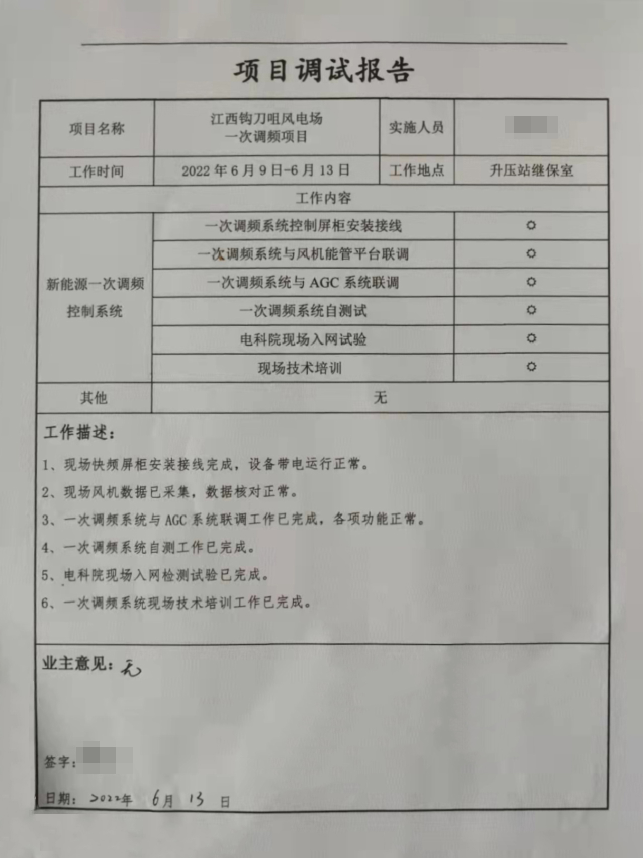 2022年6月13日鴻普惠承接的江西龍源鉤刀咀風(fēng)電場一次調(diào)頻改造順利通過入網(wǎng)檢測!