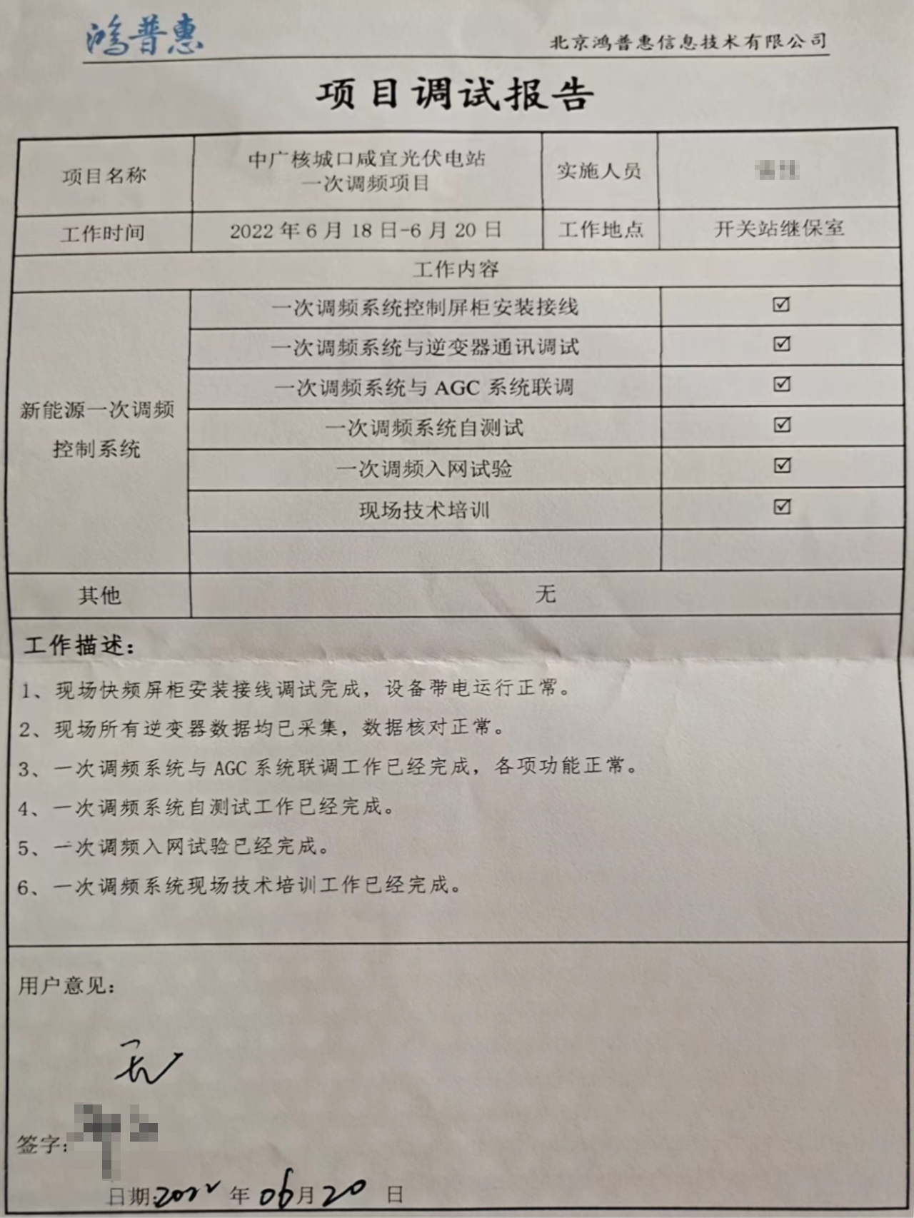2022年6月20日鴻普惠承接的中廣核城口咸宜光伏電站一次調(diào)頻改造順利通過入網(wǎng)檢測(cè)!