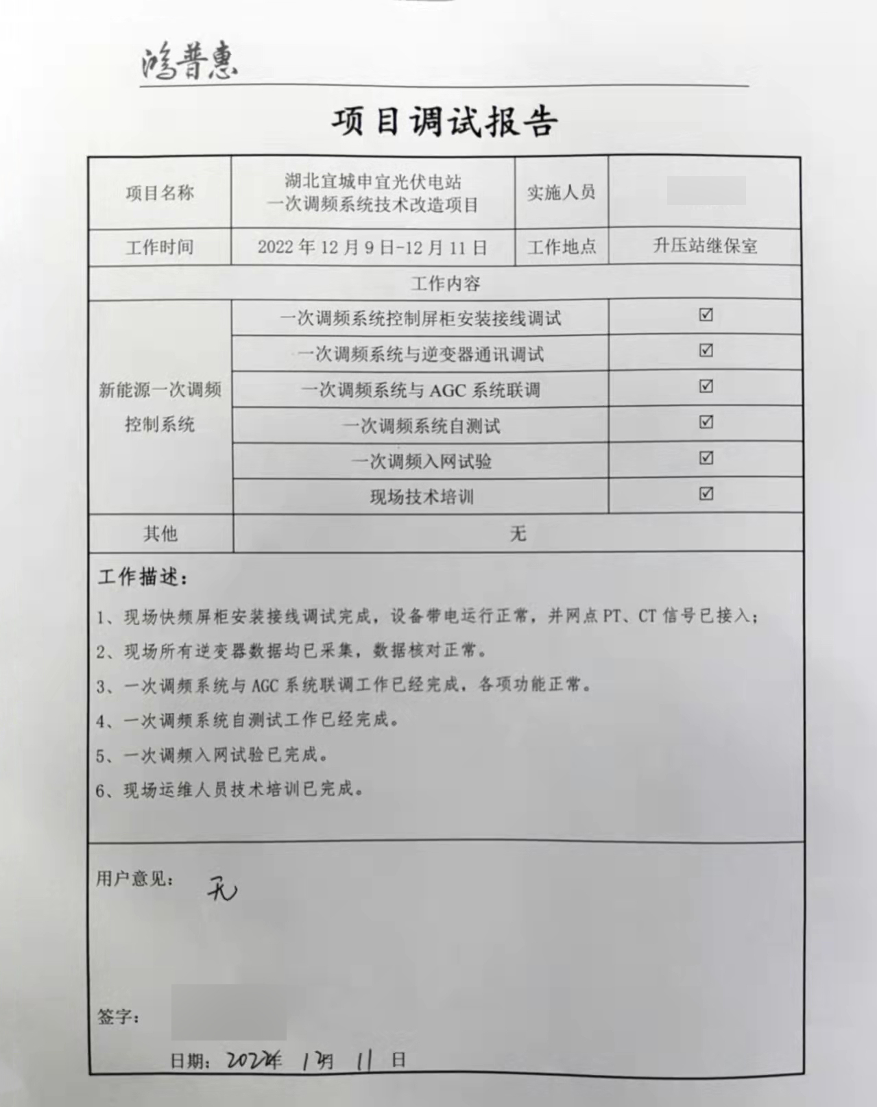 2022年12月11日鴻普惠承接的湖北宜城申宜光伏電站一次調(diào)頻系統(tǒng)技改項目順利通過入網(wǎng)檢測!感謝業(yè)主和參建單位對項目工作的大力支持!