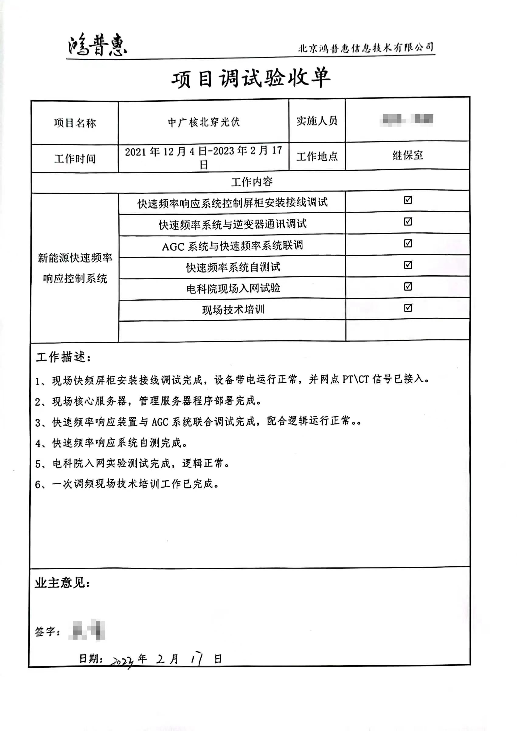 2023年2月17日鴻普惠承接的江蘇中廣核北穿光伏電站一次調(diào)頻項(xiàng)目順利通過(guò)入網(wǎng)檢測(cè)!