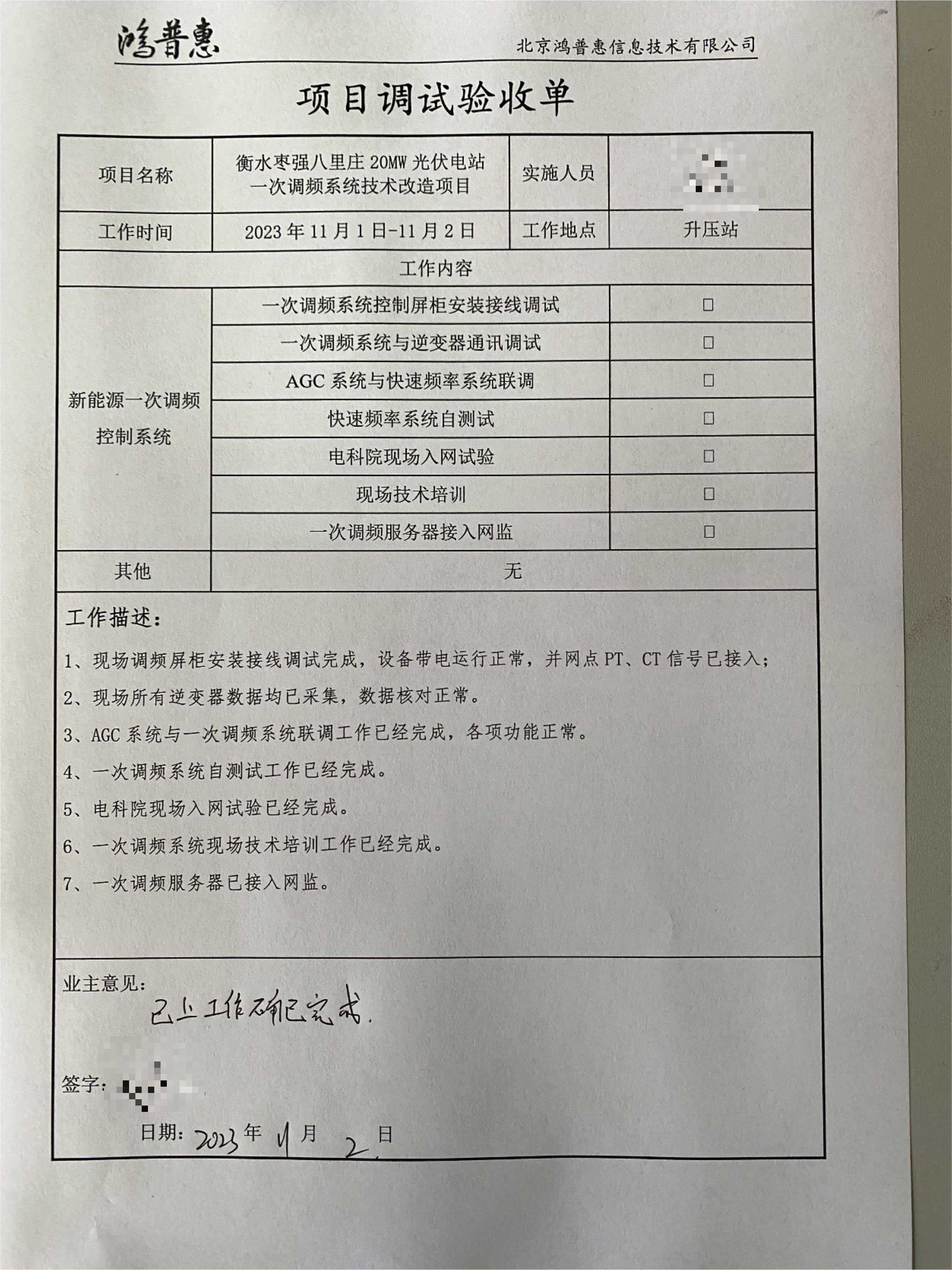 2023年11月2日,鴻普惠承接的衡水棗強(qiáng)八里莊20MW光伏電站一次調(diào)頻項(xiàng)目順利通過(guò)入網(wǎng)檢測(cè)!感謝業(yè)主、國(guó)家電網(wǎng)公司(河北)、國(guó)網(wǎng)河北能源,以及各參建單位對(duì)項(xiàng)目工作的大力支持!