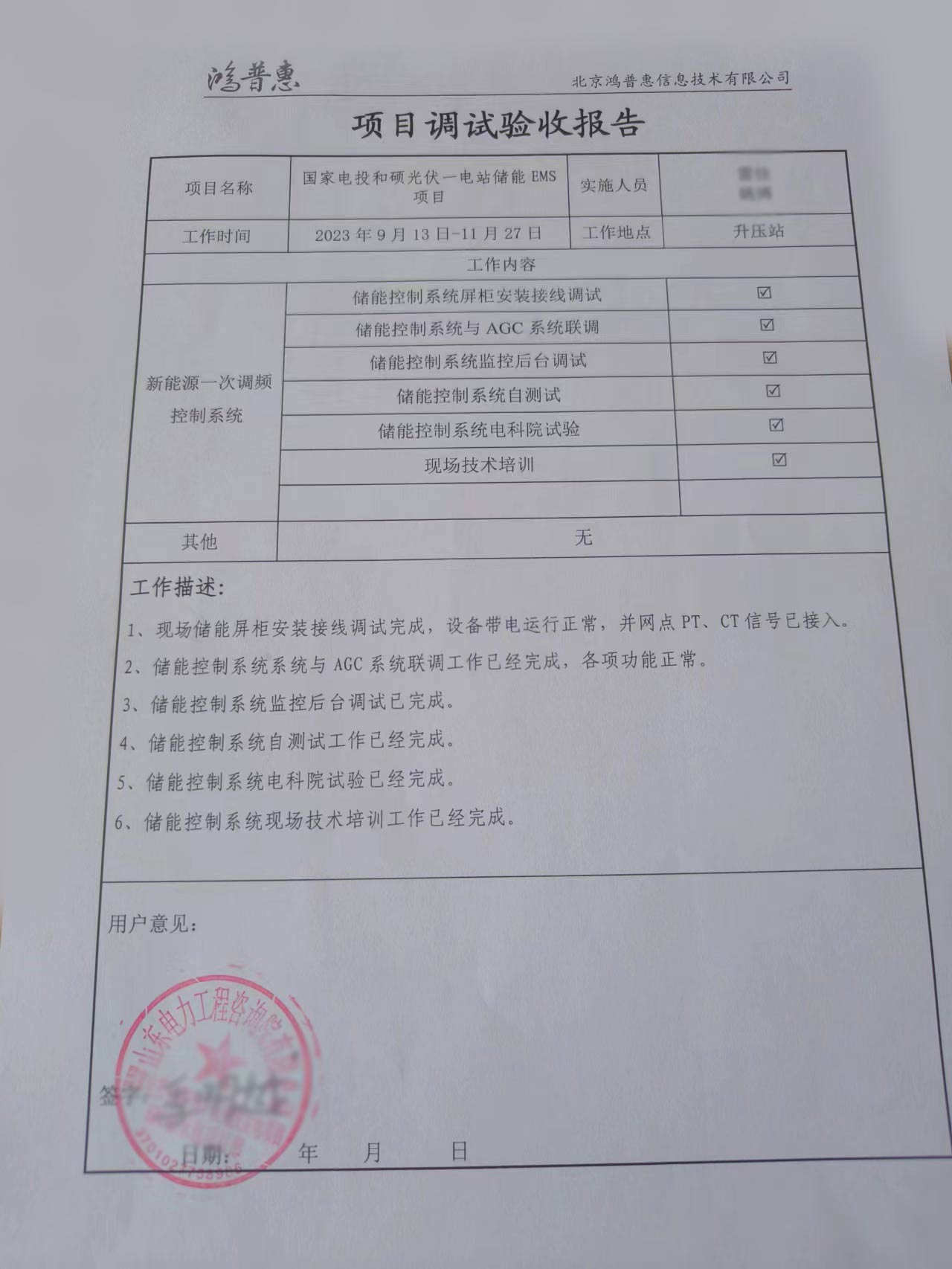 12月7日,今日是象征來年好兆頭的大雪節(jié)氣,由鴻普惠承接的國家電投和碩光伏一電站儲能EMS項目順利通過入網(wǎng)檢測!感謝業(yè)主、檢測單位以及各參建單位對項目工作的大力支持!