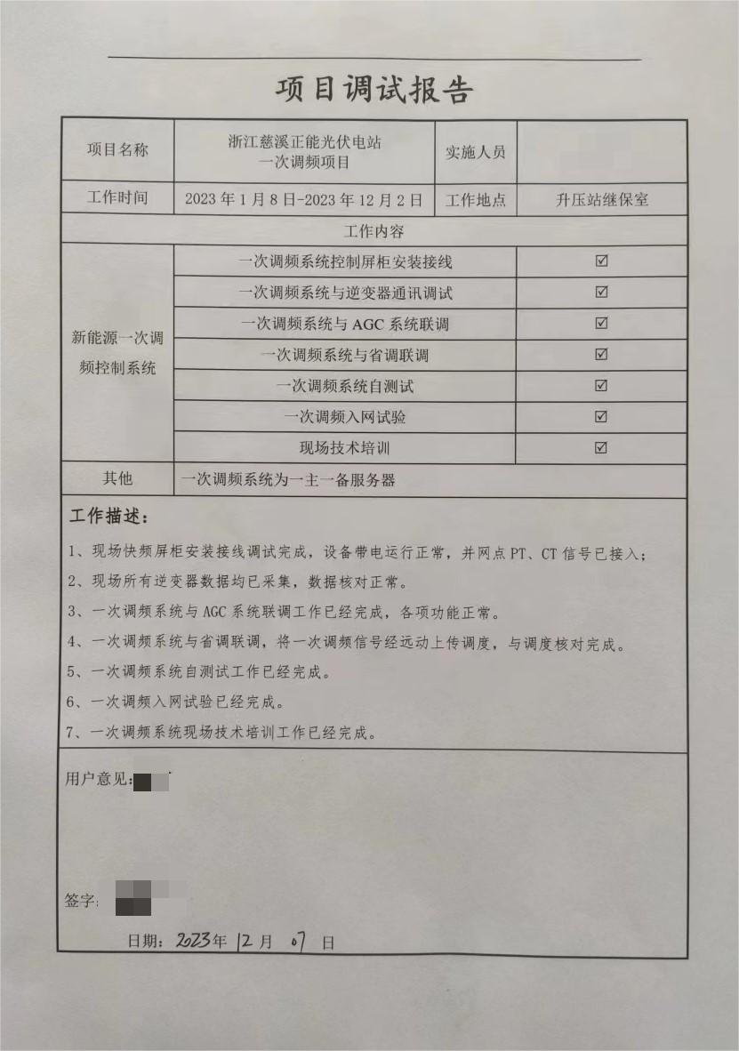 我司現(xiàn)場(chǎng)調(diào)試人員根據(jù)場(chǎng)站情況設(shè)立方案、突破難點(diǎn),客服困難,順利完成一次調(diào)頻項(xiàng)目調(diào)試,使得慈溪正能光伏電站滿足浙江電網(wǎng)一次調(diào)頻相關(guān)要求,為此項(xiàng)目取得了良好的開端!